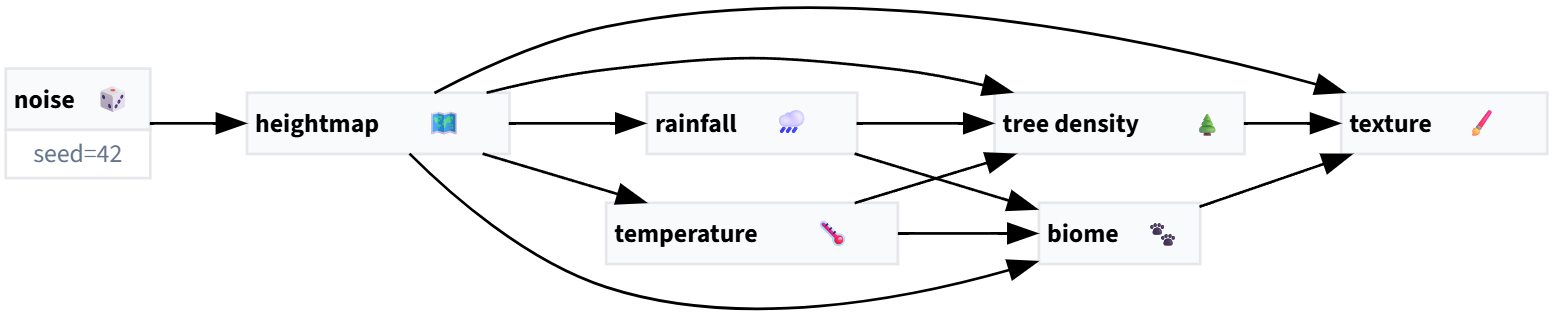 By using a spherical coordinate space, rainfall and temperature can be modeled with broad, readable rules that act globally. For example, due to the “spherical“ shape of Earth, the equator receives the most sunlight and poles the least. Using this latitude-based temperature baseline and mixing in noise for local variations we get familiar climate zones out of the box. We can also introduce other variations of temperature such as dependencies with elevation. Temperature can drop at higher altitudes. Deserts form when there is little rainfall and of course, rainforests when there is a lot. On Earth we see three peaks, most rain at the equator with two peaks at 50° above and below.