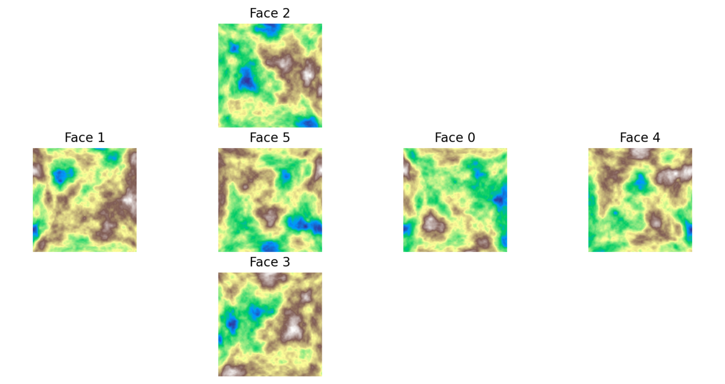 In Preface 0.1, our planet was a cube, with each face generated independently and containing a continent in the center, but lacking the global phenomena mentioned above. There were no ice caps or Sahara-like deserts. The smooth terrain noise that guided the heightmap generation, as well as procedural stages such as tree density, rainfall and temperature, had no relationship to their location on the globe. Furthermore, a whole planet required over 4,000 machine learning generated heightmaps and textures to be stitched together which took over 1.5 hours on consumer hardware.