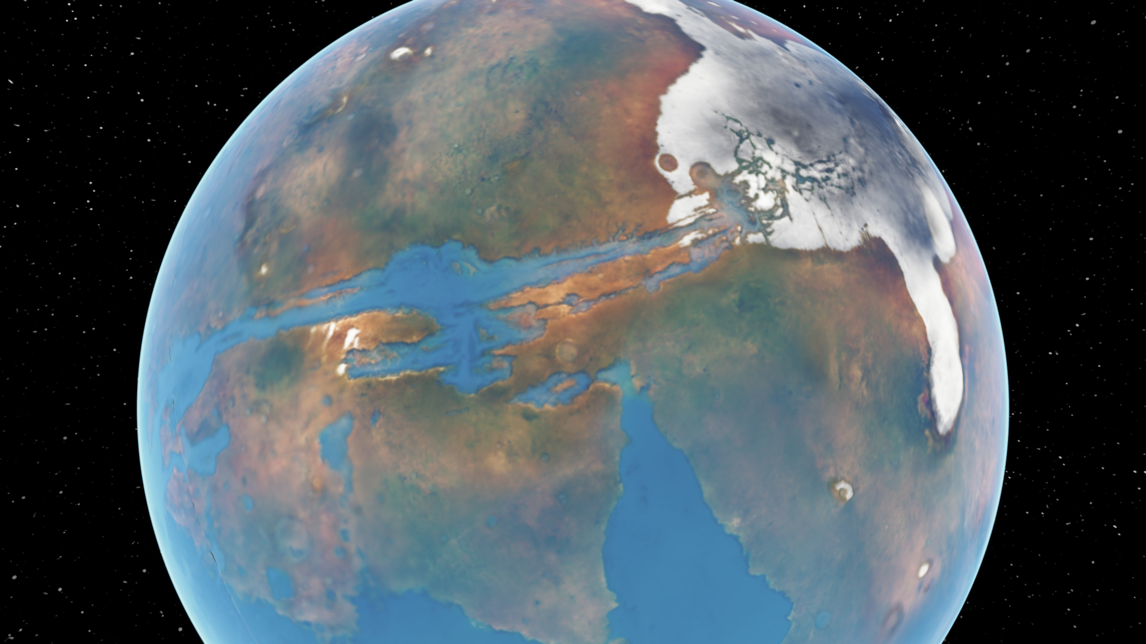 While working on vegetation and climate we had a chance to experiment by applying these to the real planet surface of Mars. You can explore Mars as it was captured by NASA’s Mars Orbiter Laser Altimeter in Preface 0.3. While an ocean now floods the lower basins of the red planet, the dry cold conditions mean no life survives to grow. But what if Mars did support life?