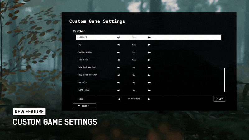 Tweak settings like weather types, time of day, survival modifiers, and other dev options to shape your experience.